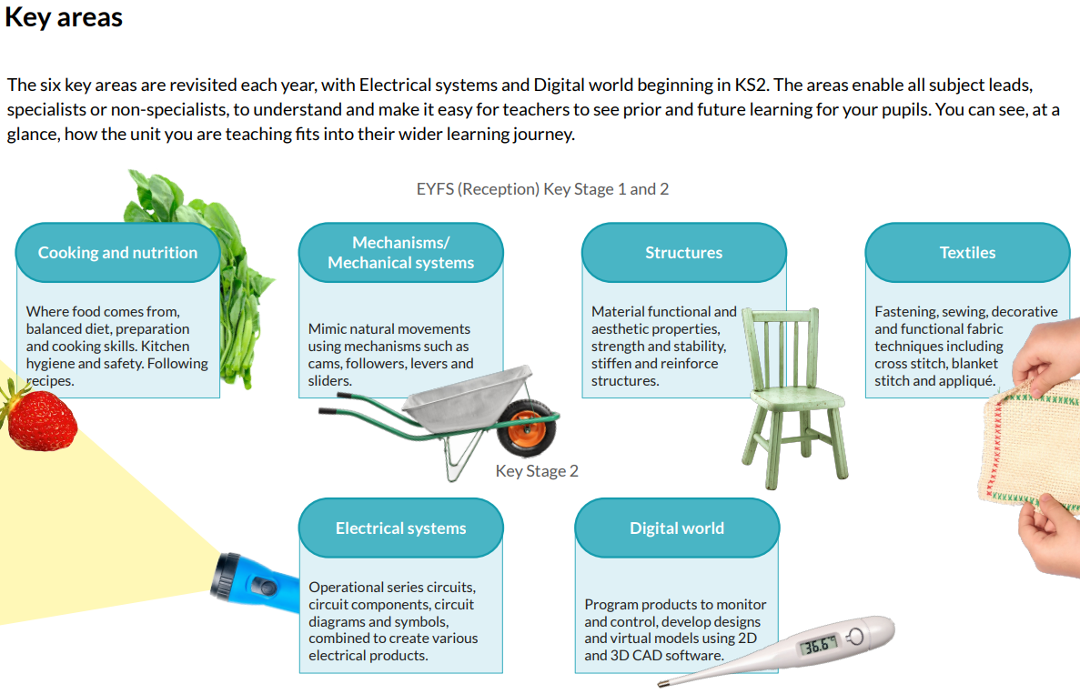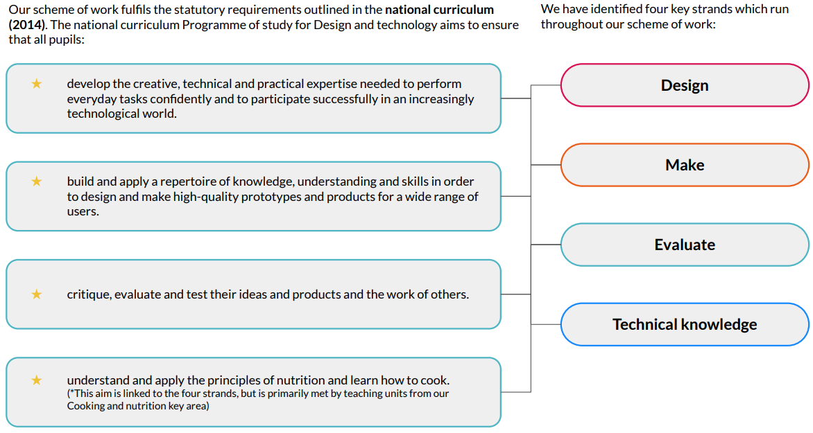 Our DT curriculum is designed so that children are able to make links with wider curriculum areas such as mathematics, science, computing, art and the humanities, where they can apply their skills to practical tasks and projects. We use Kapow as a supporting scheme, and learning is tailored so that, with time taken to explore and evaluate past and present designs, the children are able to understand the impact of everyday objects on their lives in the worldwide community. Care is taken to ensure that all learners are given the opportunity to engage in practical tasks, and support is provided where necessary to reach successful outcomes.